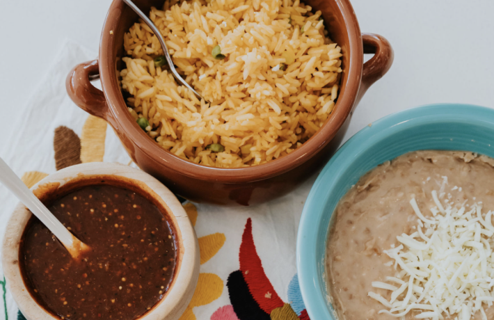 Black Beans, Cheese Poblano Dip, Mexican Rice, Refried Pinto Beans