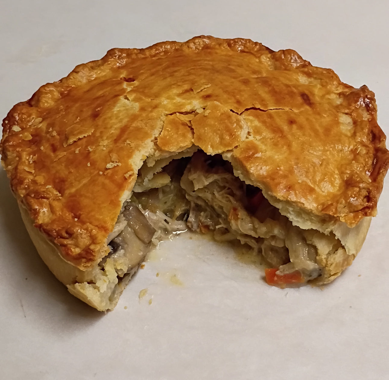 A Comforting Pie Filled With Pulled Chicken, Carrots, Mushrooms, Celery, Salt, Leek, House Herbs, Onion, Corn Starch, Butter, Flour, Water, Sugar, Black Pepper, and Cream.